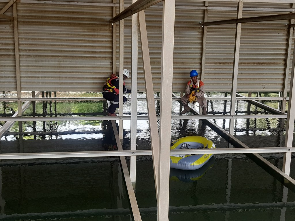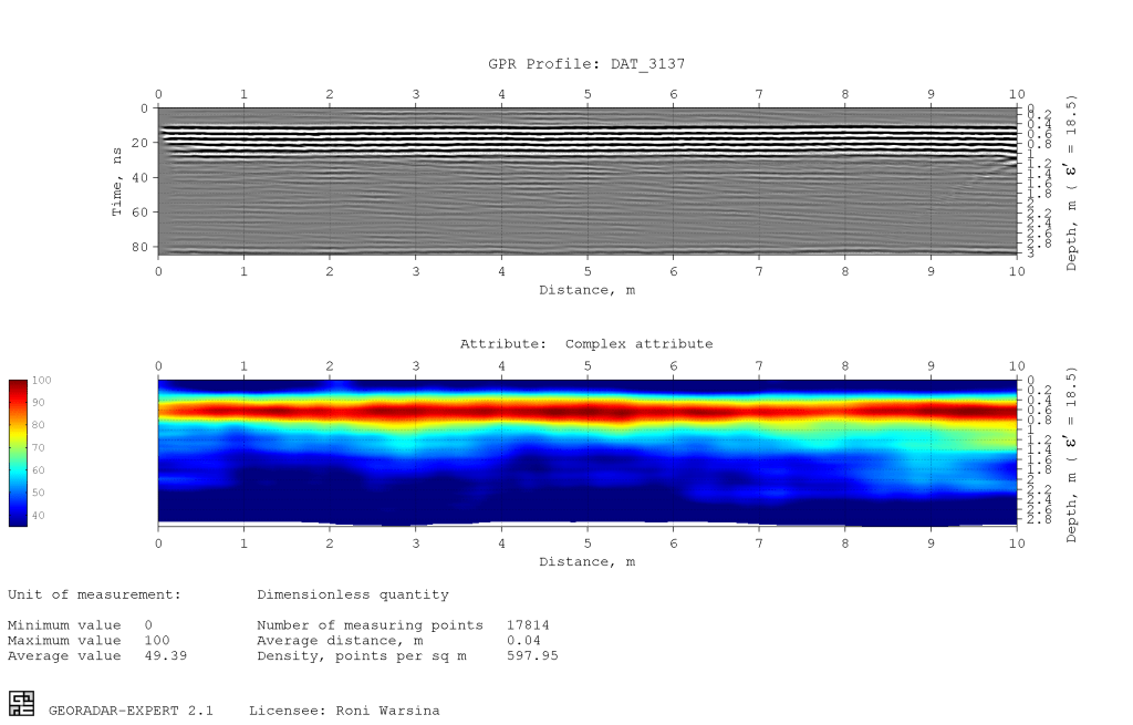 gambar paling bawah merupakan data GPR yang sudah di olah dan di transformasikan ke domain frekuensi. warna kuning ke merah tua merupakan posisi beton di bawah air dan data tersebut sudah di potong dan hanya menyisakan air sedikit yang berwarna biru di atas beton nya.