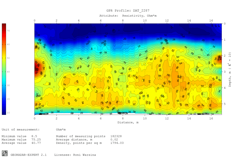 - A moderate-resistivity anomaly (~100 Ωm) at 10m depth, possibly indicating a water-filled void.