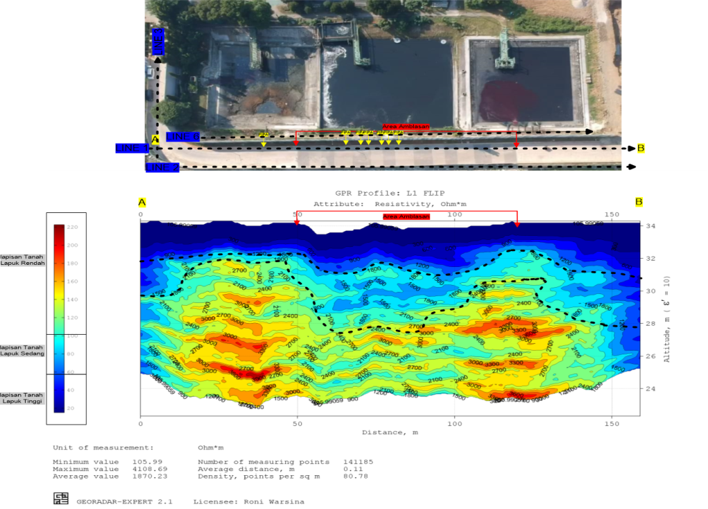- Survey tambahan (GPR atau borehole logging) untuk konfirmasi zona jenuh air