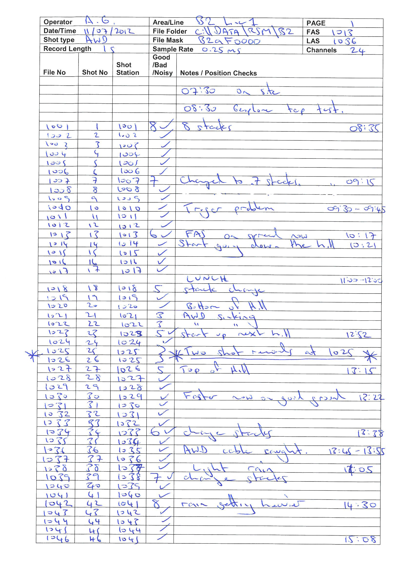 - During the period of rearming the AWD the Geophysicist is to examine the stack and confirm its quality. If necessary (excessive noise, miss-fire …) then the data should be saved and a new record collected. Saving and clearing data half way through stacking is better than at the end of the stack. Keep all data and document shots which have been shot twice.