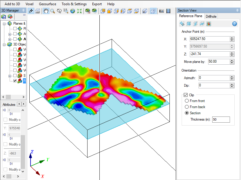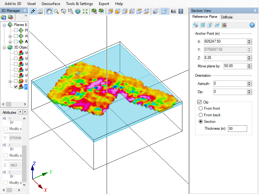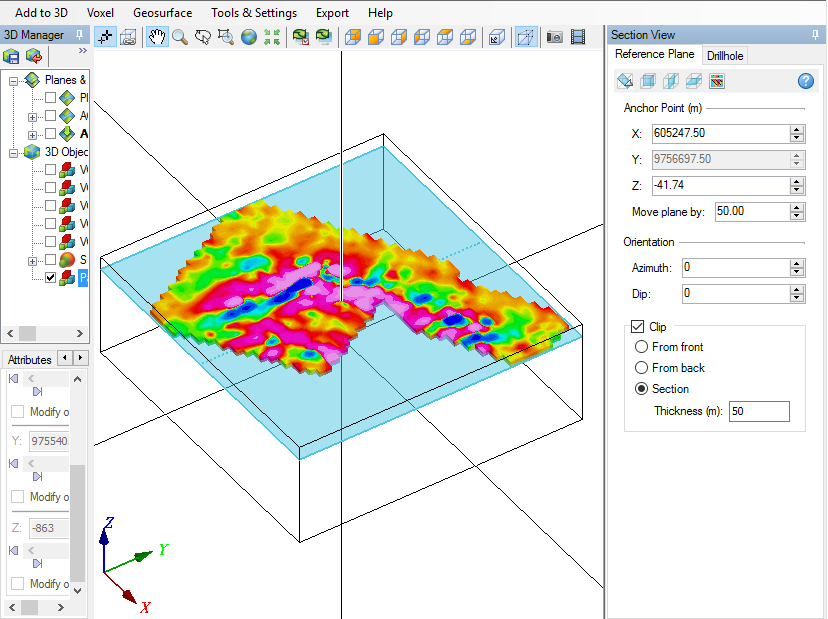 Pemodelan diatas merupakan inversi 3D yang dikombinasikan dengan data 2D permukaan meliputi data susceptibility 2D, RTP, RTE dan analisis lainya. Korelasi ini penting untuk menentukan kemenerusan objek yang akan di lakukan pengembangan atau yang akan di tambang. Pemodelan diatas mirip dengan slicing upward atau downward continuation untuk melihat kemenerusan sebaran ke bawah permukaan tetapi dalam pemodelan inversi 3D sudah dalam domain kedalaman(depth).