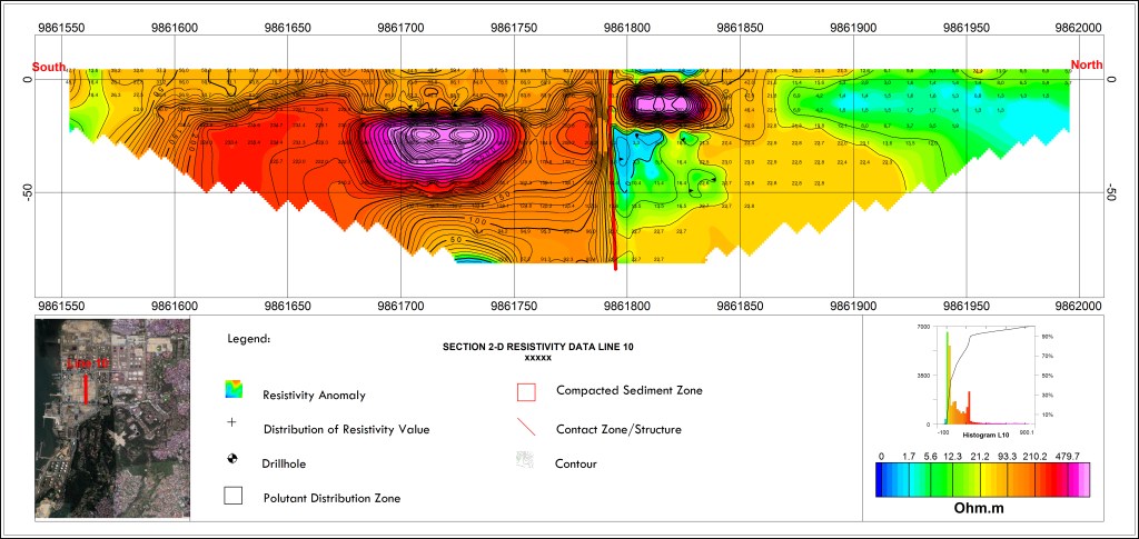 Gambar pertama merupakan hasil pengukuran geolistrik di area yang relatif tidak terkena limbah sedangkan gambar bawah merupakan hasil yang terkontaminasi dengan limbah kimia.
