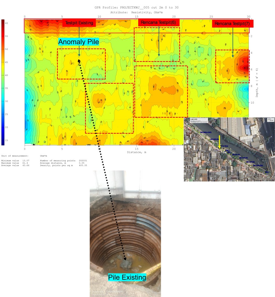 Pengecekan obstacle atau material selain tanah seperti beton,pile, boulder, pipe dan lainya sangat direkomendasikan dengan metode GPR. dengan metode GPR dan pengolahan tingkat lanjut akan memudahkan gambaran bawah permukaan bukan hanya objek pipa dan kabel tetapi juga objek lain. contoh di atas adalah kasus pengecekan concrete dan pila yang ada di area jalur pemasangan pipa HDPE. Pengecekan dan analisa lanjutan ini penting untuk melihat secara komprehensif objek yang ada sehingga validasinya sampai 90%.