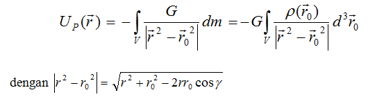 Jika massa yang terdistribusi kontinu mempunyai rapat masa p(ro) di dalam volume(v) maka potensial disuatu titip P diluar V adalah: